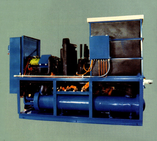 40 horsepower, split system, water chiller with reservoir and pumps. This system uses an air-cooled condenser (not shown) which is mounted on the roof of the building. This chiller was used to keep process water at 40 degrees F, plus or minus 1 degree.