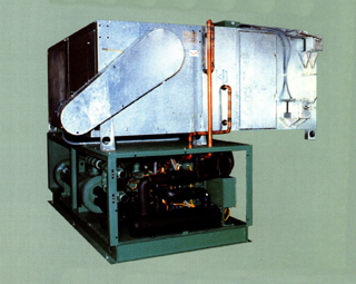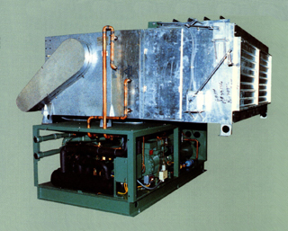 15 horsepower, air cooler chiller with space heating option. This unit is used for cooling insulating oil used in the manufacture of Transformers. Its duty is to cool 15,000 gallons of oil from 203 degrees F to 77 degrees F in 27 hours or less. The heat which is removed from the oil during this cool down process is used for space heating of the plant in the winter. Plant air is drawn into the mixing box through the return air dampers. (Photo 1) The air passes the condenser coil and is heated to approximately 120 degrees F. The air is then discharged out of the top of the unit by two centrifugal blowers (not visible). This air is then distributed through the shop by a duct system. In the summer the condenser air is drawn from outside and returned there by the duct system. Dampers in the supply ducts are used to divert air inside or outside. The quantity of heat available for space heating is 300,000 BTU/H.