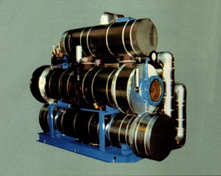 40 horsepower, water cooled chiller system used to condition air. A system was need for a manufacturing process to handle 3,800 SCFM of 40 degrees F air at -40 degrees F dew point, 5 PSI. This unit is capable of cooling air from 163 degrees F, 100% RH to 40 degrees F, 100% RH. In this cooling process, water is condensed and the removed at the air exiting end of the chiller. The air the enters a desiccant dryer (not shown) where the dew point is reduced to -40 degrees F. A flooded evaporator is used to keep the air pressure drop to a minimum.